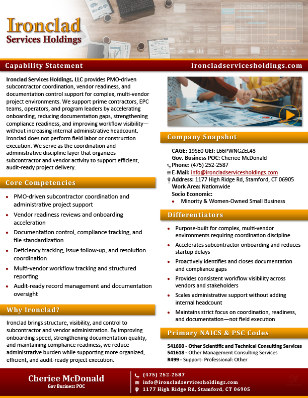 Ironclad works as a structured support-services partner for complex project environments that rely on multiple participating vendors, contractors, and stakeholders. The company focuses on contractor readiness support, onboarding and administrative coordination, compliance documentation tracking, reporting visibility, deficiency follow-up, and PMO-style execution support that strengthens accountability without adding unnecessary internal overhead. In nuclear-related environments specifically, Ironclad is positioned to support the broader project ecosystem through coordination, documentation discipline, and workflow support rather than ownership, engineering, or direct plant operations. This approach allows clients to improve operational consistency, documentation discipline, and cross-party alignment in highly structured environments.